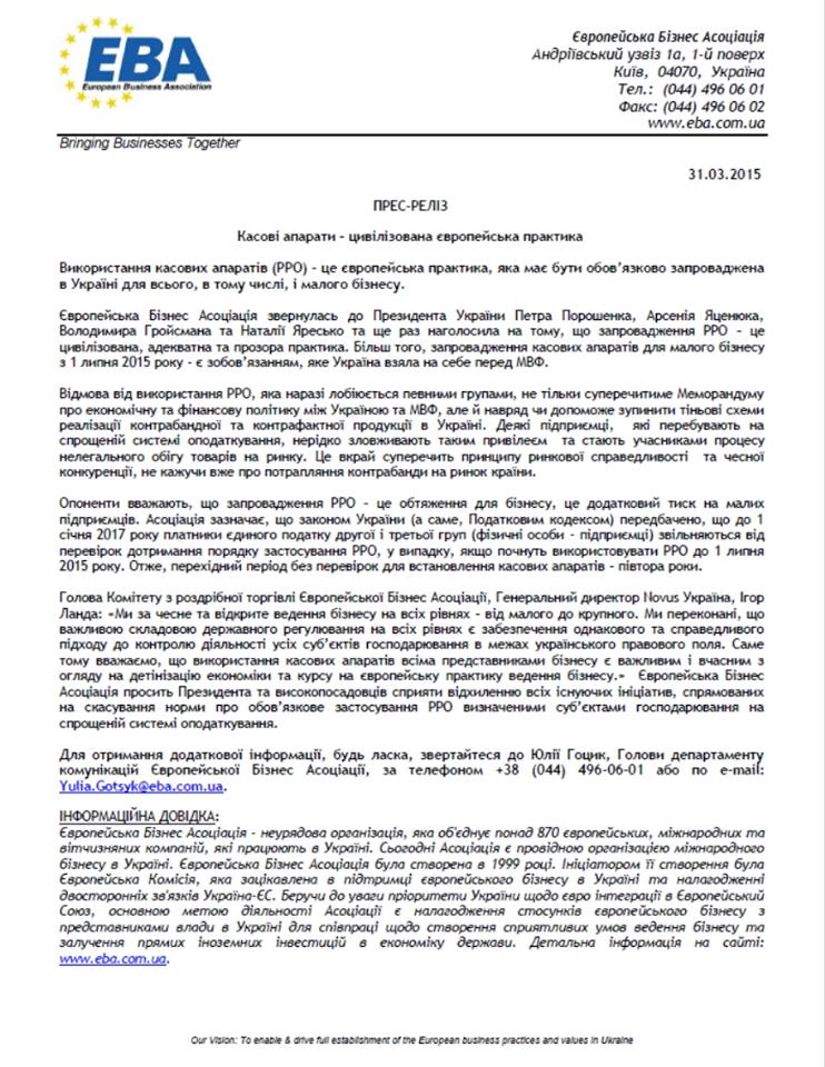 Видимо опасаясь, что все-таки кассовые аппараты для предпринимателей могут быть отменены под давлением представителей малого бизнеса, ЕБА ещё в марте обратилась ко высшему руководству Украины с просьбой отклонить все существующие инициативы, направленные на отмену нормы об обязательном применении РРО определенными субъектами на упрощенной системе налогообложения.
