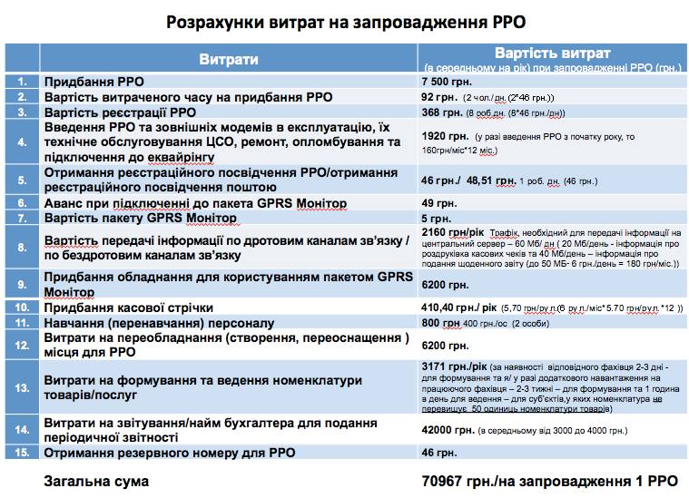 Введение РРО не даст положительного фискальный эффекта; увеличит стоимость администрирования бизнеса, не будет способствовать детенизации экономики; создаст неравные конкурентные условия для ведения предпринимательской деятельности субъектами хозяйствования, потому что чем мельче субъект предпринимательства, тем дороже ему обходиться применение РРО; государственный бюджет несет значительные потери от администрирования ввода в эксплуатацию РРО субъектами малого бизнеса более чем 53 млн. грн.; создаст дополнительные затраты на администрирование и обработку соответствующей отчетности субъектов и осуществление контрольных функций Государственной фискальной службой Украины; будет способствовать дополнительным коррупционным рискам (выборочные проверки, дополнительные штрафы); не приведет к ограничению контрабанды и контрафакта, не исключает сокрытия наличности; нивелирует суть упрощенной системы налогообложения. Об этом говорится в пояснительной записке к анализу затрат субъектов малого предпринимательства на выполнение норм применения регистраторов расчетных операций.