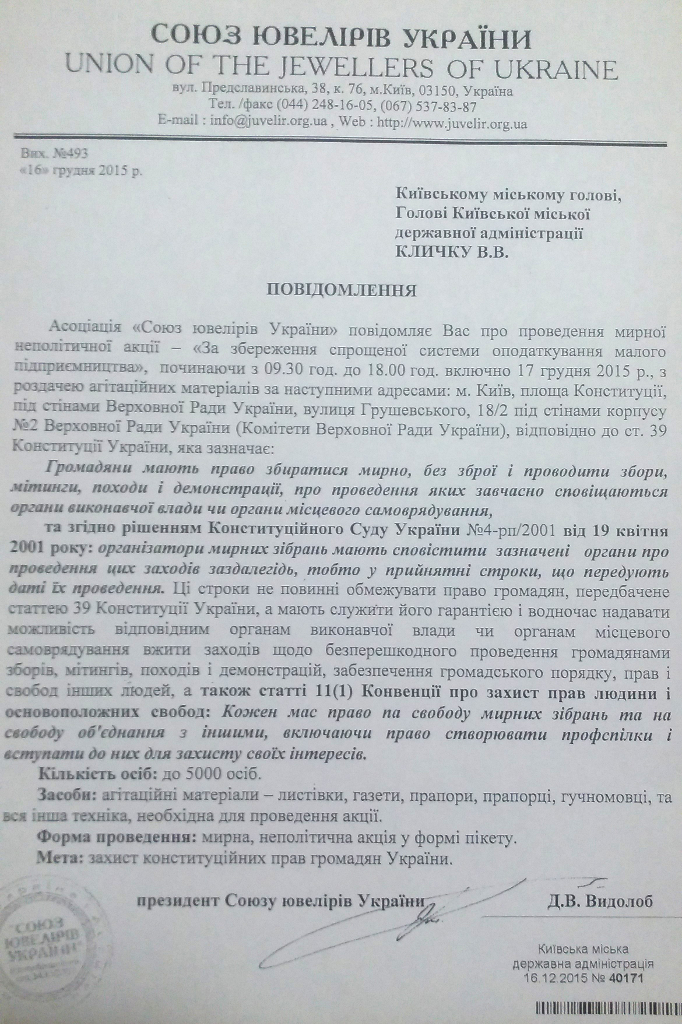 Союз ювелірів України виступив співорганізатором акції 17.12.2015 р. разом з ВОМСБ «Фортеця», ВГО «Союз захисту підприємництва», ГС «Національна асамблея України», «Українською таксомоторною асоціацією» та організаціями аграріїв – це ті організації, які виділяли кошти і вживали всіх заходів, щоб акція відбулась якомога масштабнішою. Безпосередньо у мітингу взяли участь представники інших об'єднань та чисельні небайдужі громадяни.