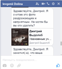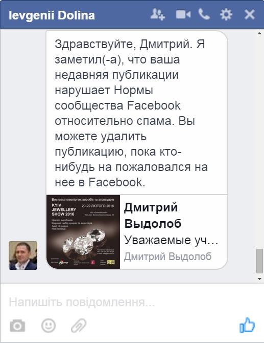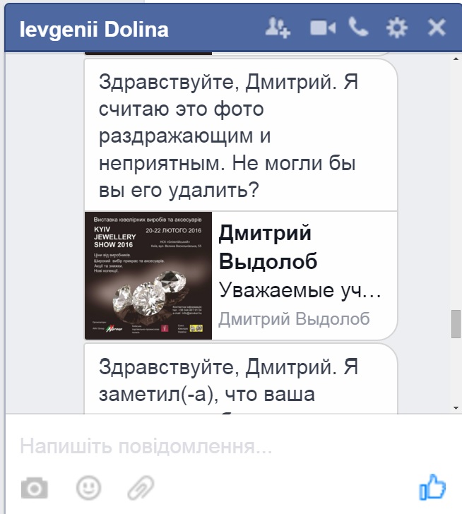 Даже пост в Facebook, в котором опубликована программа мероприятий выставки "Kyiv Jewellery Show", господин Долина считает раздражающим и неприятным, к тому же якобы нарушающим Нормы Сообщества Facebook относительно спама, и просит его удалить.