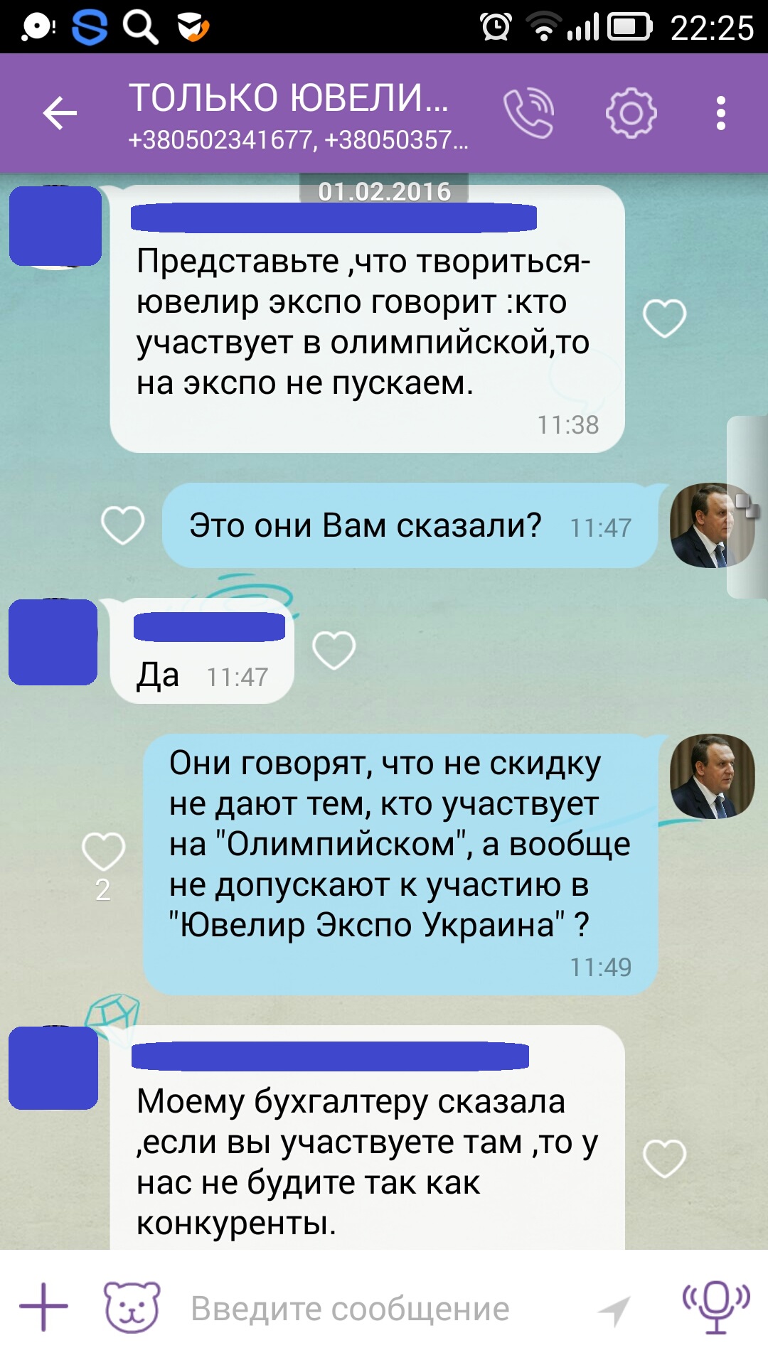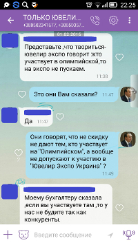 Но, видимо, это не всем приходится по душе. Руководитель другой ювелирной выставки, которая проводится в другие периоды года и в другом месте - на Киев Экспо Плазе, Евгений Долина вместе со своими подчиненными обзванивает руководителей ювелирных компаний и угрожает, что если они примут участие в выставке "Kyiv Jewellery Show", им будет отказано в участии на Киев Экспо Плазе. А также рассказывает всякие небылицы о ходе подготовки выставке на НСК "Олимпийский" и обещает инициировать проверки контролирующими органами (!!!) во время её проведения.