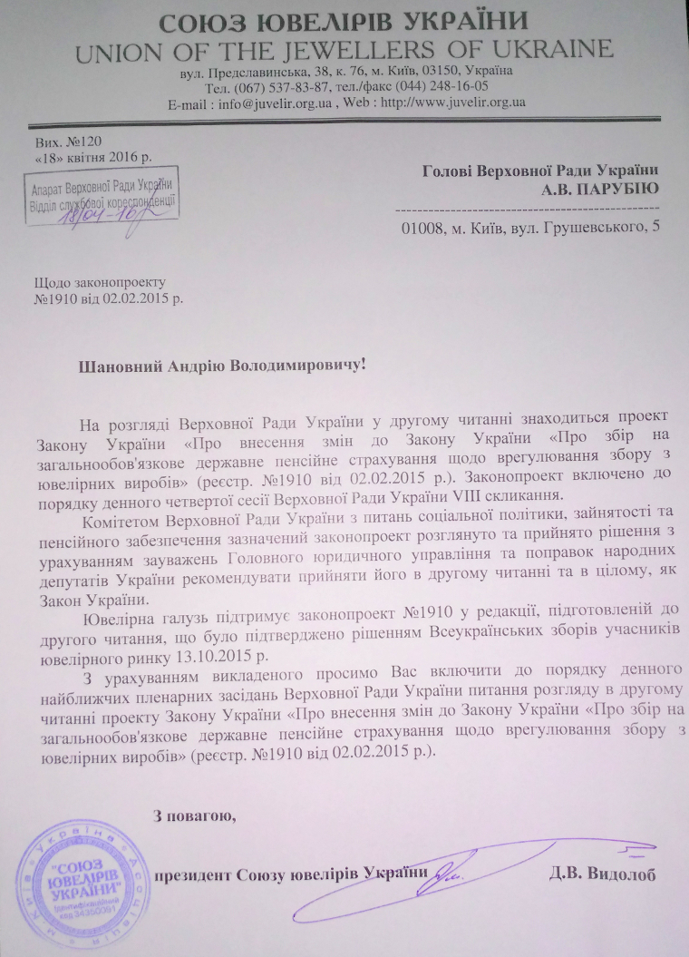 Сьогодні президент Союзу ювелірів України Дмитро Видолоб направив на адресу новообраного Голови Верховної Ради України Андрія Парубія звернення щодо необхідності включення до порядку денного найближчих пленарних засідань парламенту та розгляду у другому читанні проекту Закону України «Про внесення змін до Закону України «Про збір на загальнообов'язкове державне пенсійне страхування щодо врегулювання збору з ювелірних виробів» (реєстр. №1910 від 02.02.2015 р.), внесеного народними депутатами України Оксаною Продан, Олександрою Кужель та Олександром Ксенжуком.