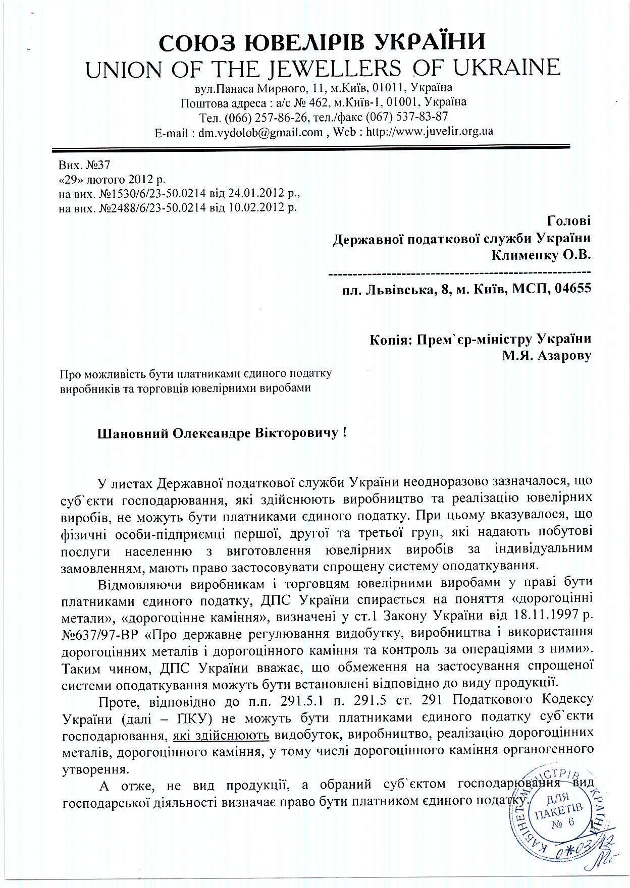 Скачать копию письма Союза ювелиров Украины от 29.01.2012 г. №37 :