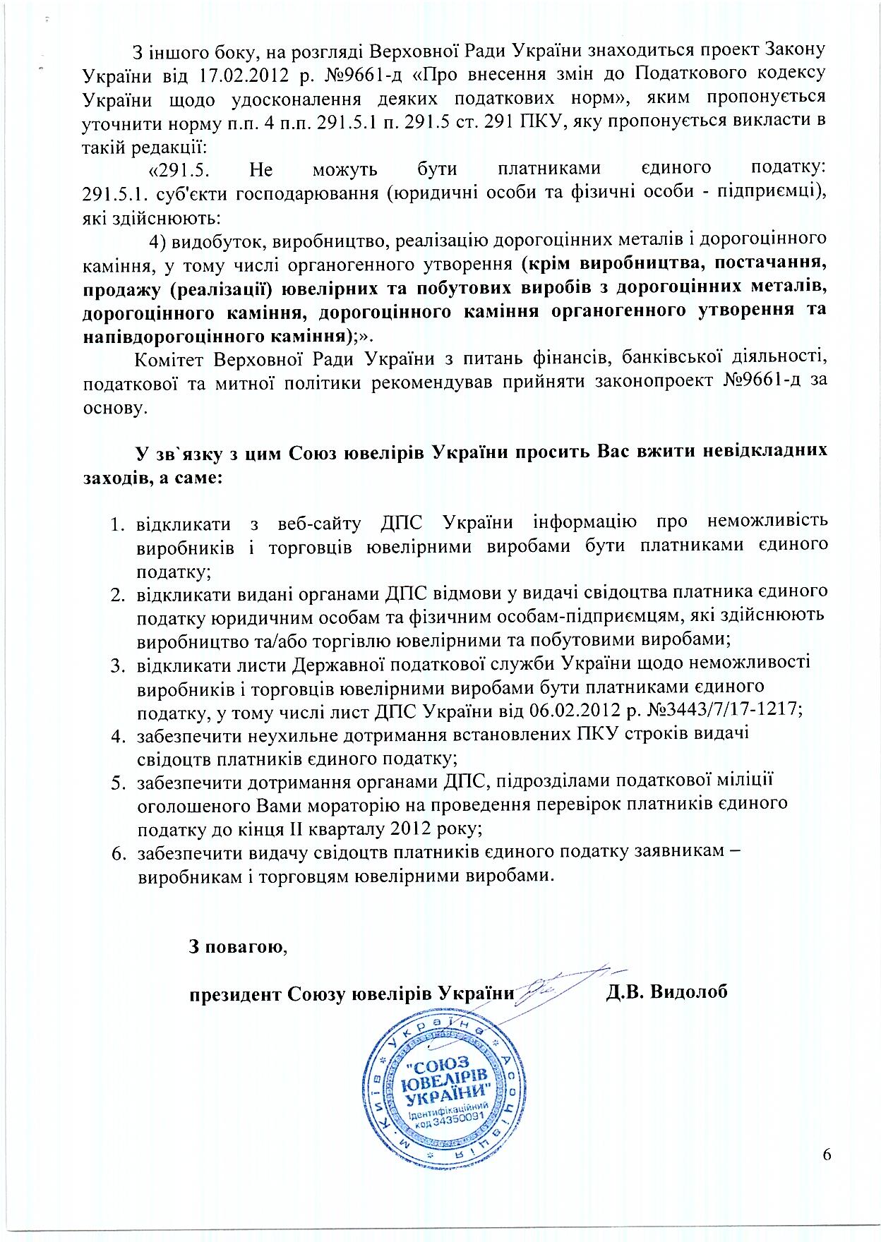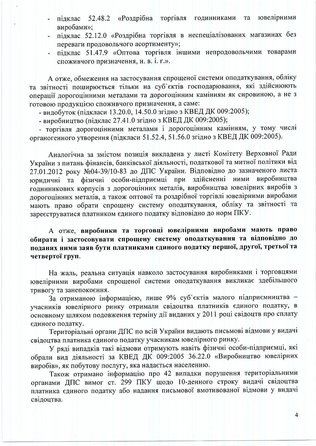 Союз ювелиров Украины обращается с письмами о праве малого ювелирного бизнеса на единый налог в территориальные налоговые органы
