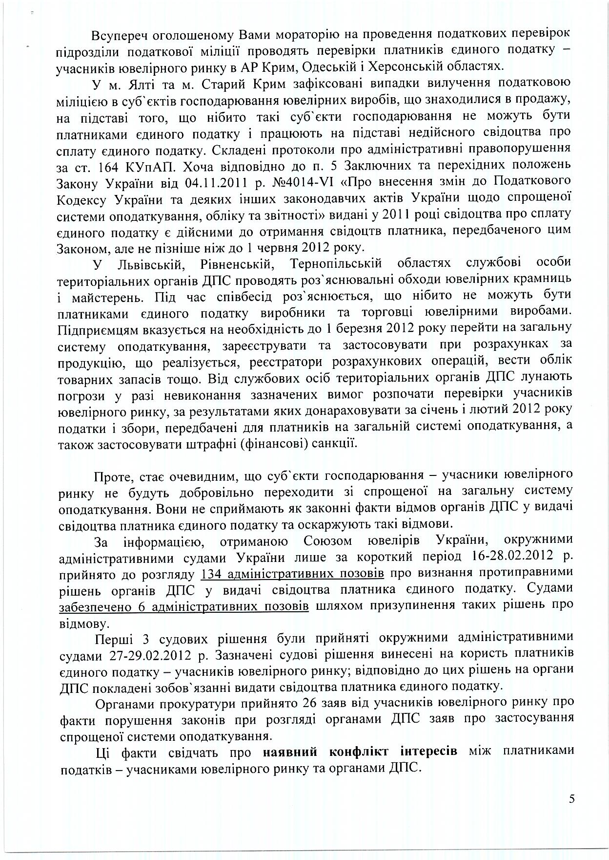 После подачи в Государственную налоговую службу Украины письма от 29.02.2012 г. №37 (с направлением копии Премьер-Министру Украины Н.Я. Азарову) Союз ювелиров Украины обращается с аналогичными по смыслу письмами в те территориальные органы ГНС, где зафиксированы факты отказов в выдаче свидетельства плательщика единого налога производителям и торговцам ювелирными изделиями; в отношении выданных отказов участниками ювелирного рынка поданы иски в административные суды, заявления в прокуратуру либо жалобы в вышестоящие налоговые органы.