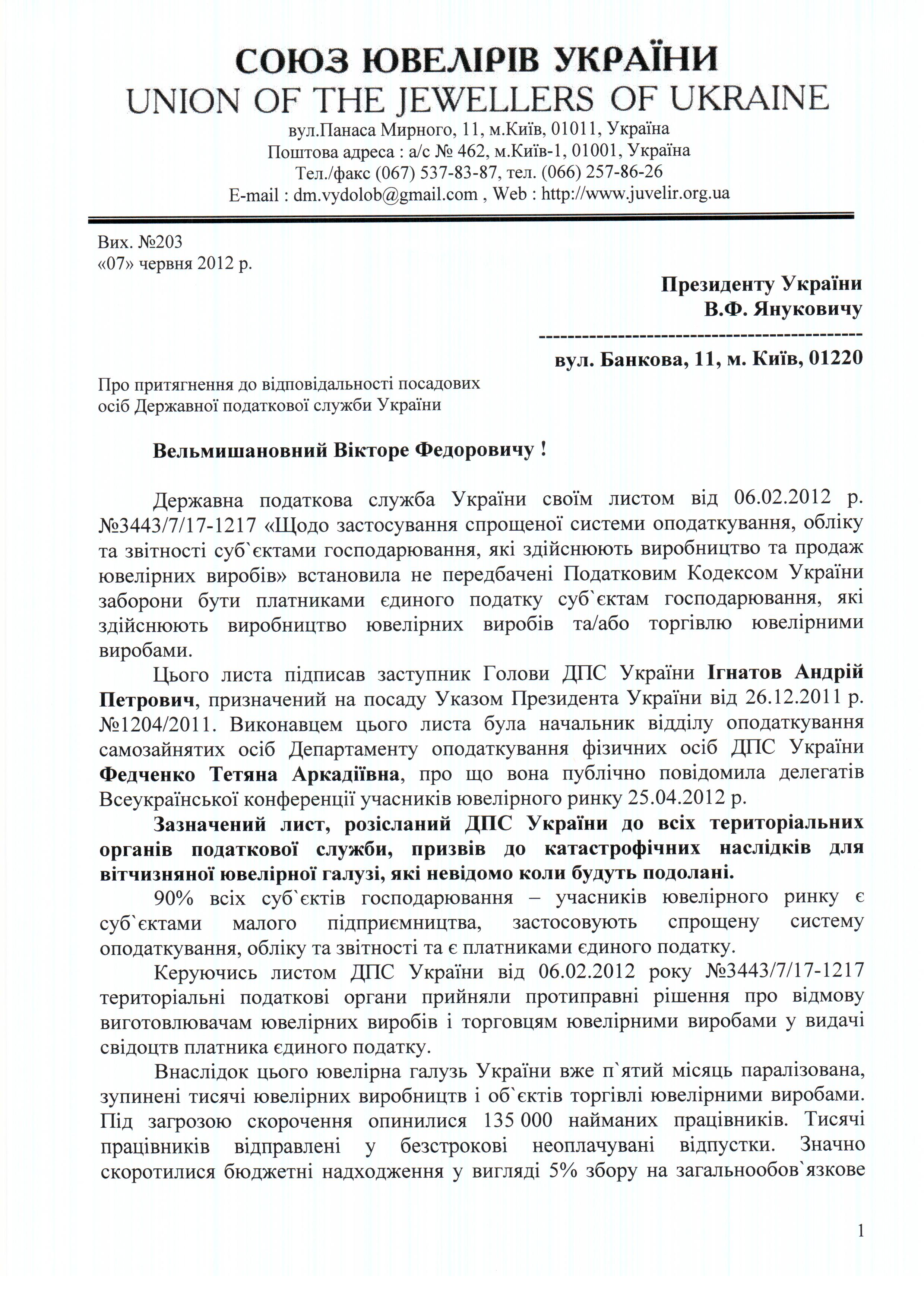 Закликаємо Вас підтримати звернення Союзу ювелірів України, скласти аналогічні звернення до Президента України В.Ф. Януковича та Першого Віце-Прем`єр-Міністра України В.І. Хорошковського, зібрати підписи підприємців – учасників ювелірного ринку під цими зверненнями. Звернення та підписні аркуші просимо направляти поштою або спеціальним зв`язком на відповідні адреси В.Ф. Януковича та В.І. Хорошковського, зазначені у текстових файлах для збирання підписів.
