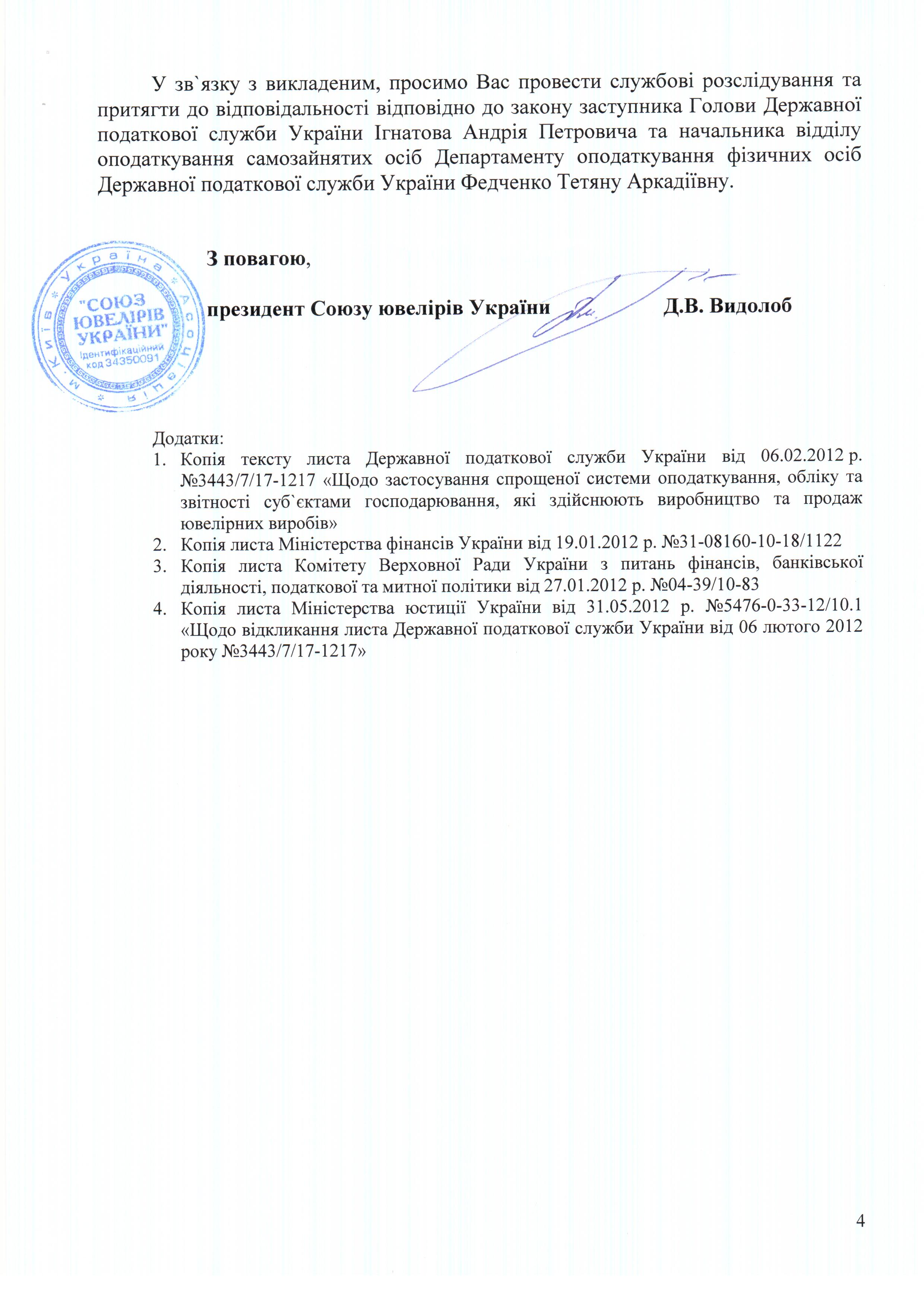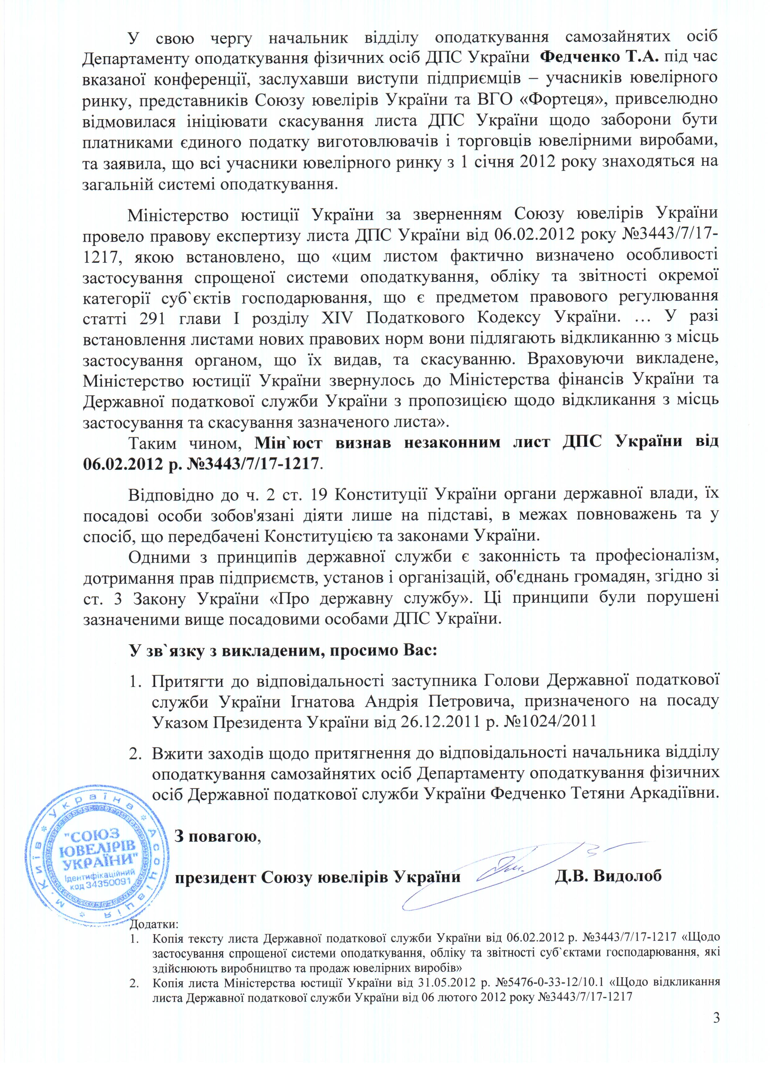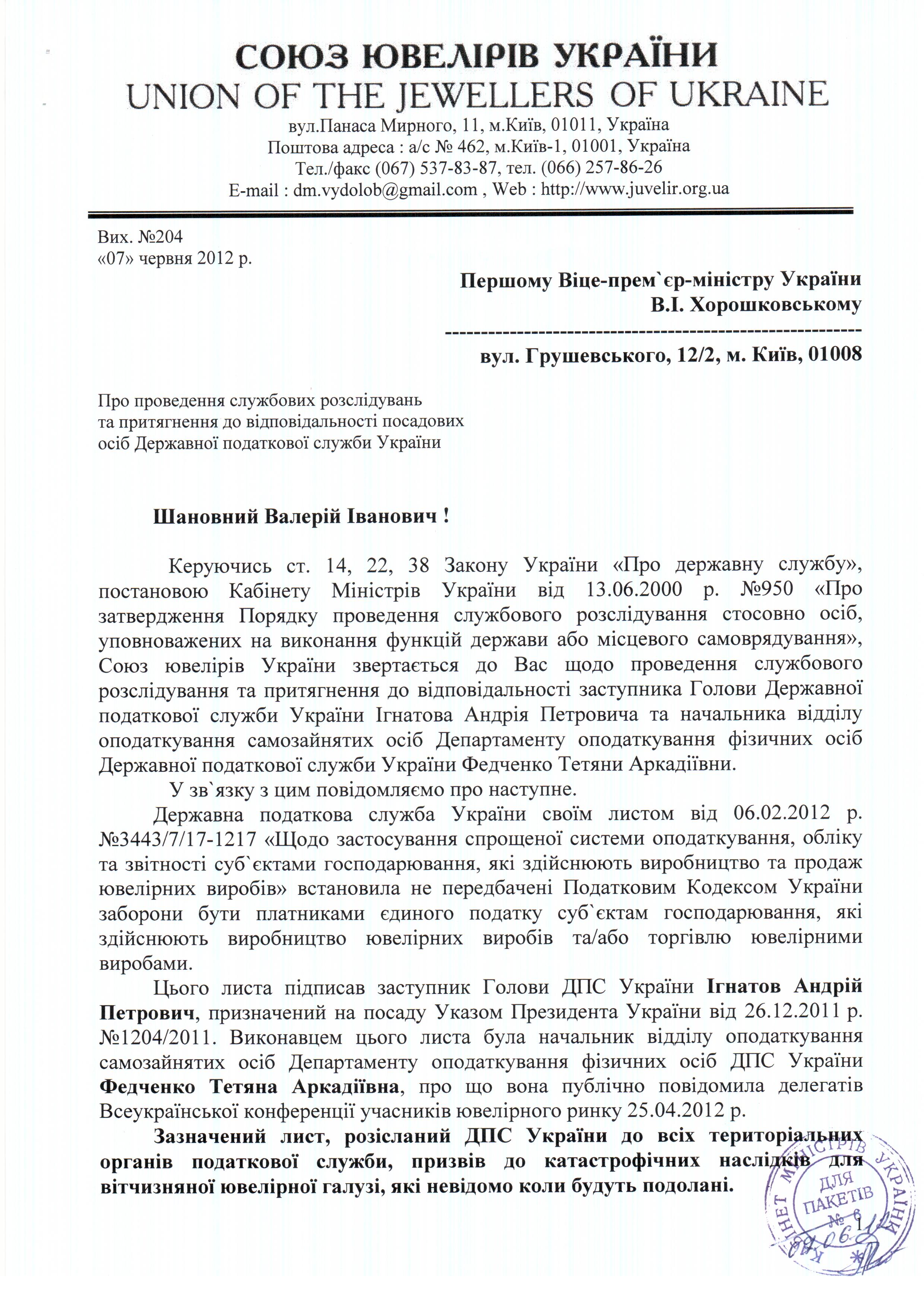 На виконання цього пункту Резолюції Союз ювелірів України направив офіційні звернення щодо притягнення до відповідальності згідно з законом посадових осіб Державної податкової служби України, які мають безпосереднє відношення до розроблення та видання листа Державної податкової служби України від 06.02.2012 р. №3443/7/17-1217, а саме: