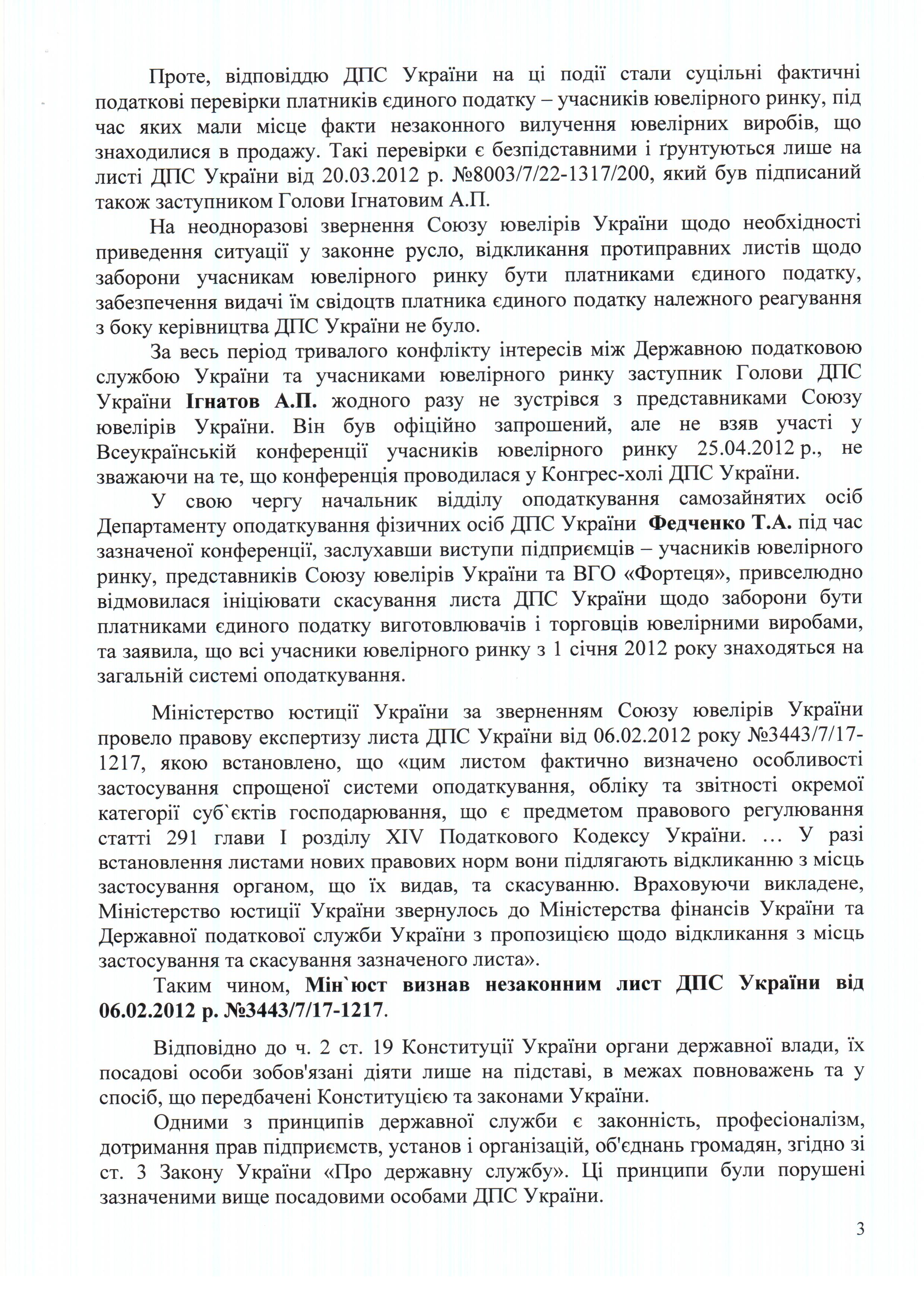 Міністерство юстиції України за зверненням Союзу ювелірів України провело правову експертизу листа Державної податкової служби України від 06.02.2012 р. №3443/7/17-1217, яким було штучно запроваджено заборону бути платниками єдиного податку виготовлювачам ювелірних виробів і торговцям ювелірними виробами, що не передбачено Податковим Кодексом України.