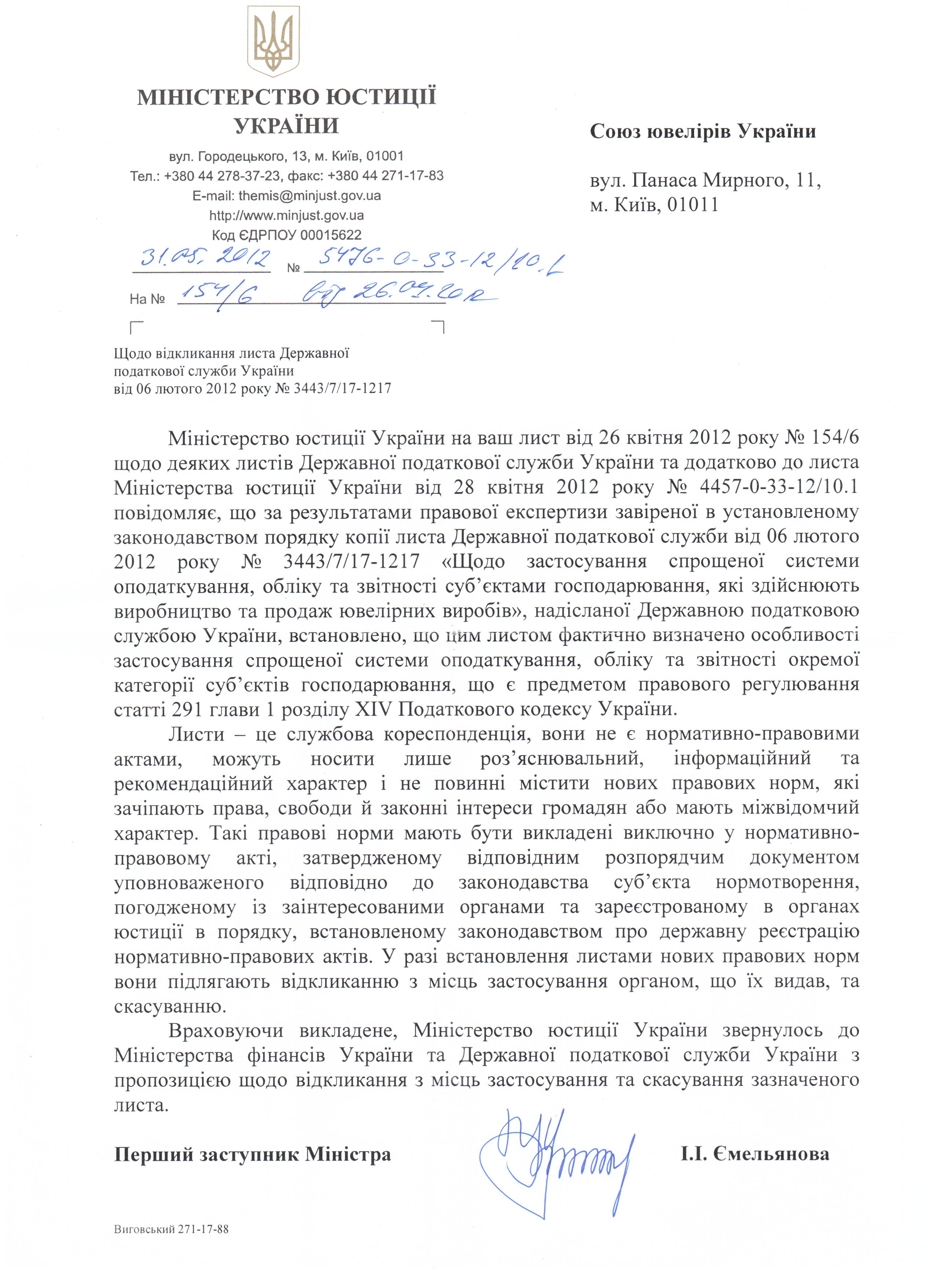 Фотокопію листа Міністерства юстиції України до Союзу ювелірів України Ви можете скачати ТУТ.