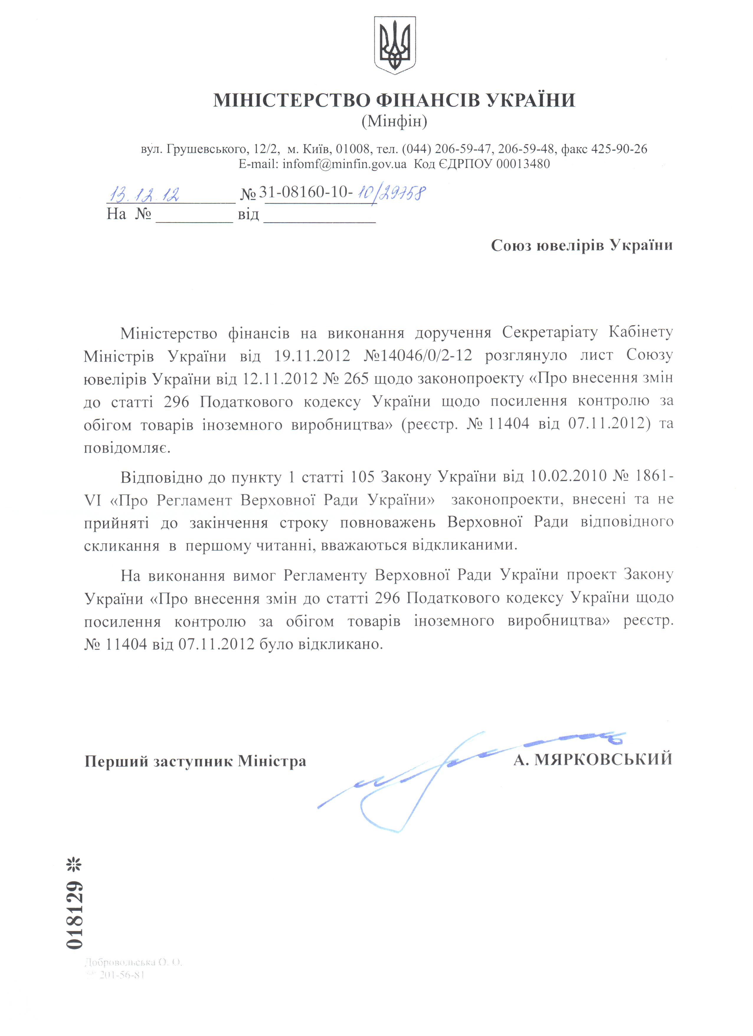 Союз ювелірів України неодноразово звертався до Кабінету Міністрів України та Верховну Раду України з приводу проблемного проекту Закону України від 07.11.2012 р. №11404 «Про внесення змін до статті 296 Податкового кодексу України щодо посилення контролю за обігом товарів іноземного виробництва».