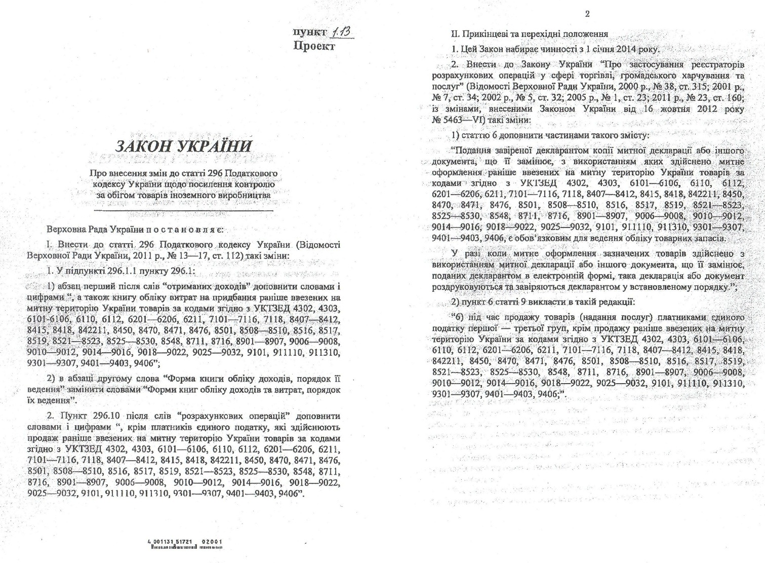 Фотокопію законопроекту «Про внесення змін до статті 296 Податкового кодексу України щодо посилення контролю за обігом товарів іноземного виробництва», розглянутого Кабінетом Міністрів України 06.03.2013 р. можна скачати ТУТ.
