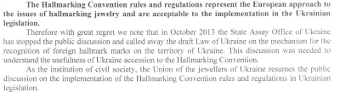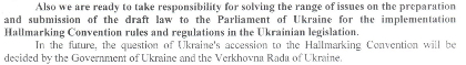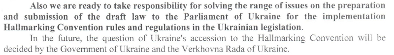 «Також ми готові взяти на себе відповідальність за вирішення широкого кола питань з підготовки та внесення на розгляд парламенту України проекту закону щодо імплементації норм і правил Пробірної Конвенції в законодавство України, - говориться у зверненні Союзу ювелірів України, - у подальшому питання про приєднання України до Пробірної Конвенції буде вирішуватися Урядом України та Верховною Радою України».