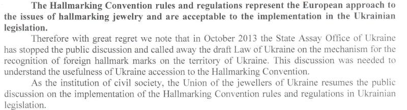 Тому ми з великим жалем відзначаємо, що в жовтні 2013 року Державна пробірна служба України зупинила громадське обговорення і відкликала проект Закону України щодо механізму визнання іноземних пробірних клейм на території України. Ця дискусія була необхідна, щоби зрозуміти корисність приєднання України до Пробірної Конвенції».