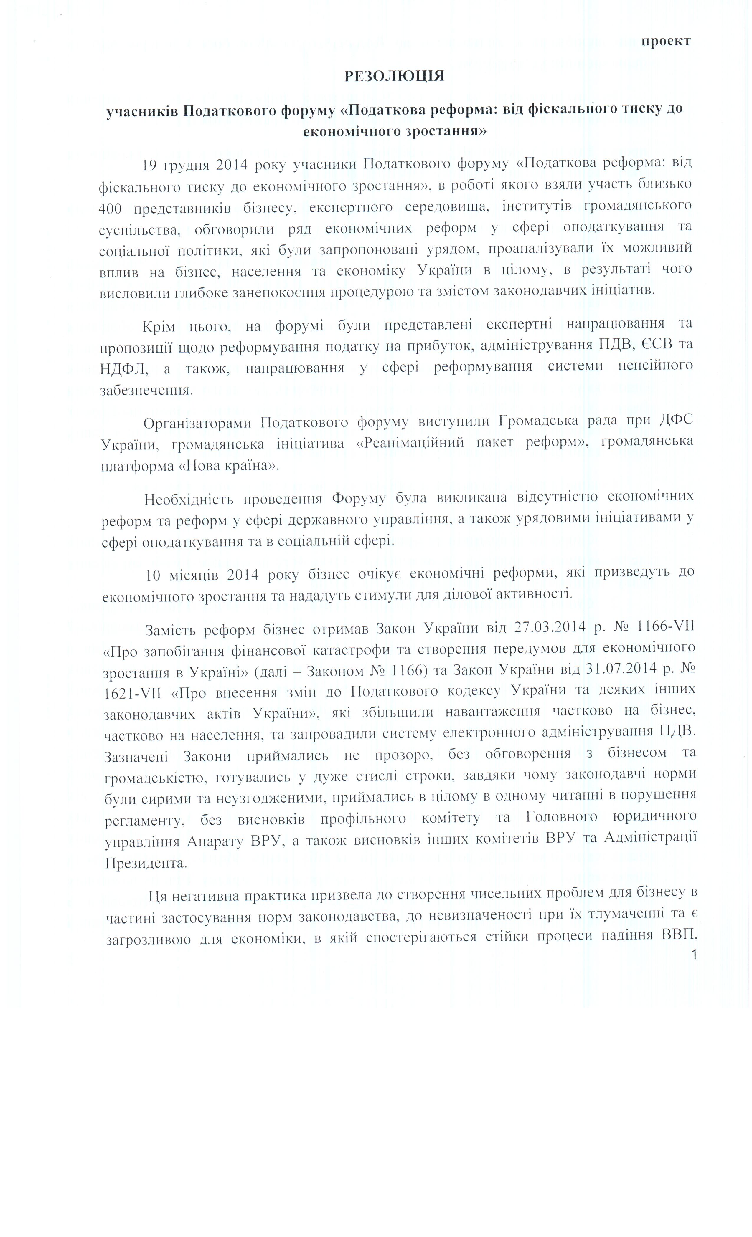 Налоговая реформа, предлагаемая Кабинетом Министров Украины, была подвергнута жесткой критике. По результатам форума была принята резолюция, текст которой представляем Вашему вниманию:
