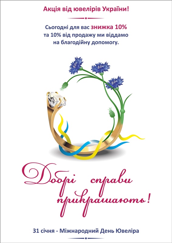 Поддерживая акцию, наша организация приглашает всех участников ювелирного рынка Украины принять в ней участие! Плакаты и баннеры акции доступны для свободного использования. Вы можете их скачивать, распечатывать в цвете и свободно применять для участия в акции.