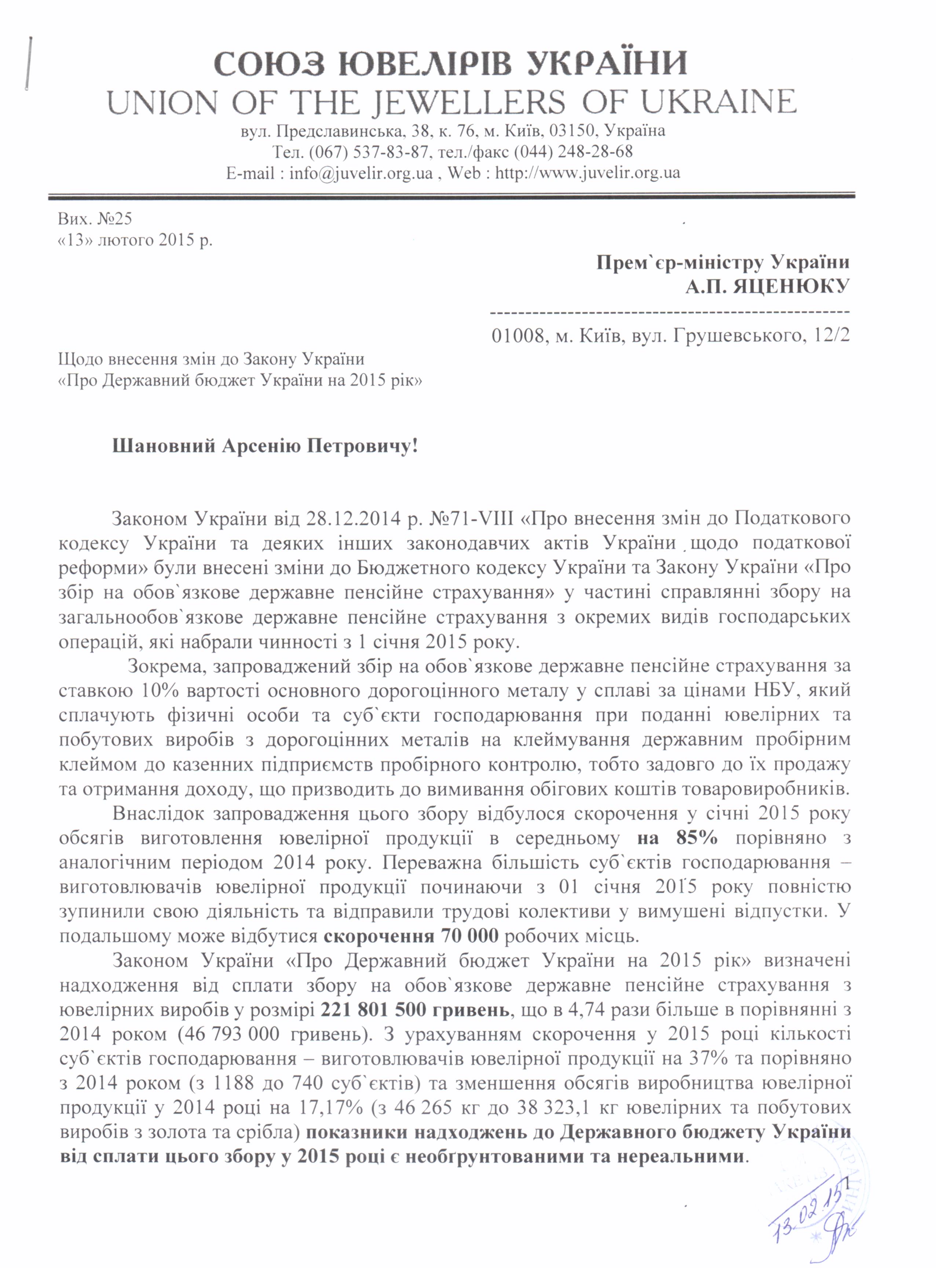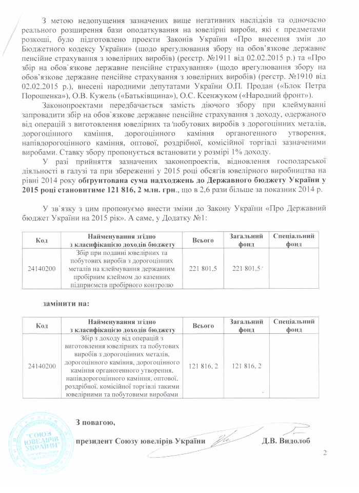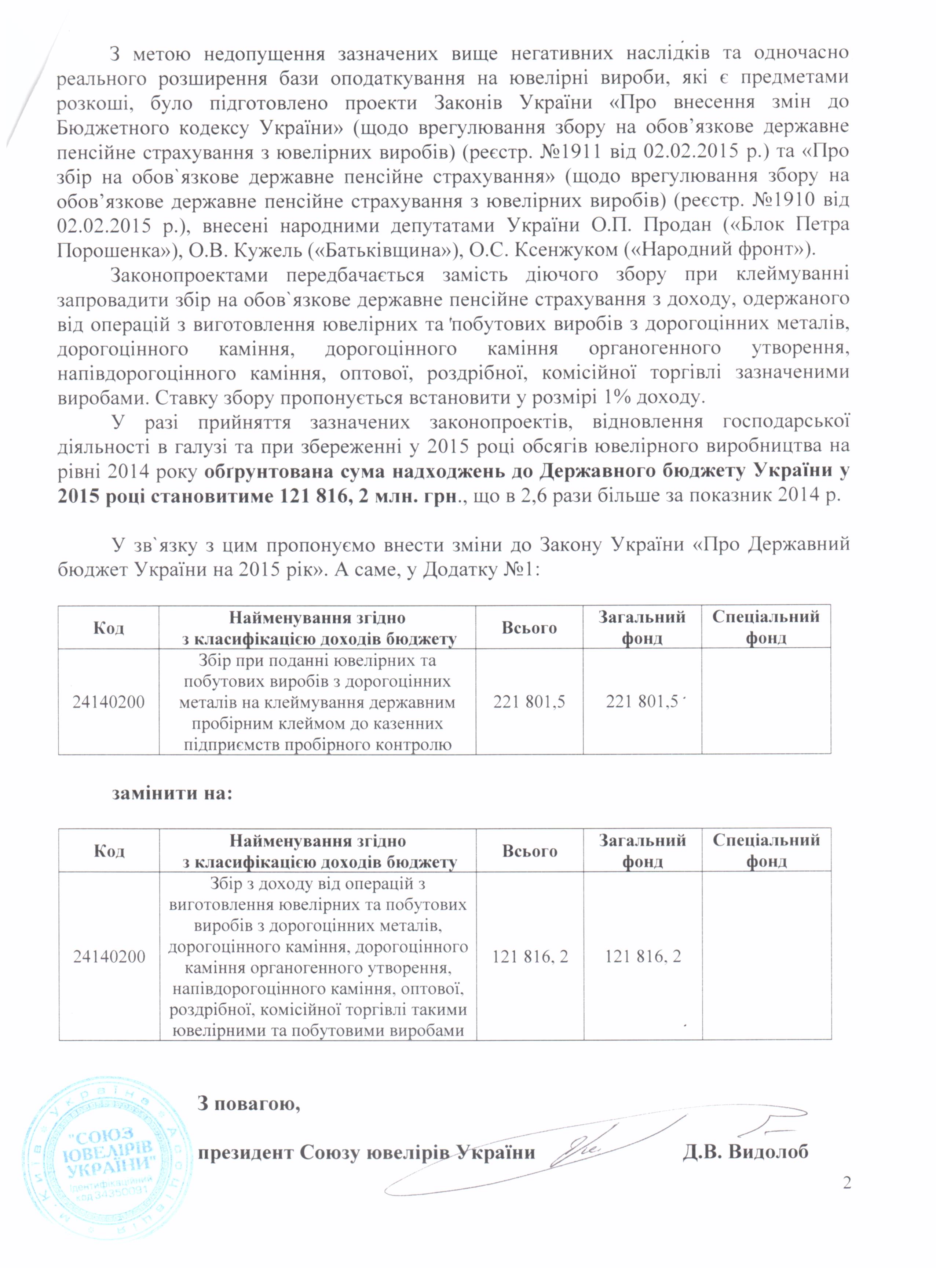 Сьогодні нашою організацією направлені до Кабінету Міністрів України та Міністерства фінансів України пропозиції щодо зміни найменування статті доходів Державного бюджету від збору на загальнообов`язкове державне пенсійне страхування з ювелірних виробів та розміру показника бюджетних надходжень – з 221 801 500 грн. до 121 816 200 грн.